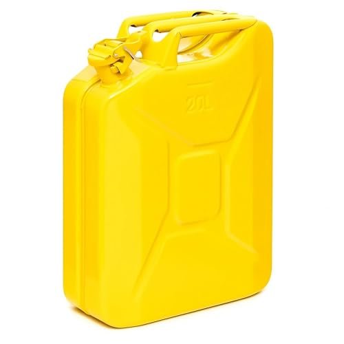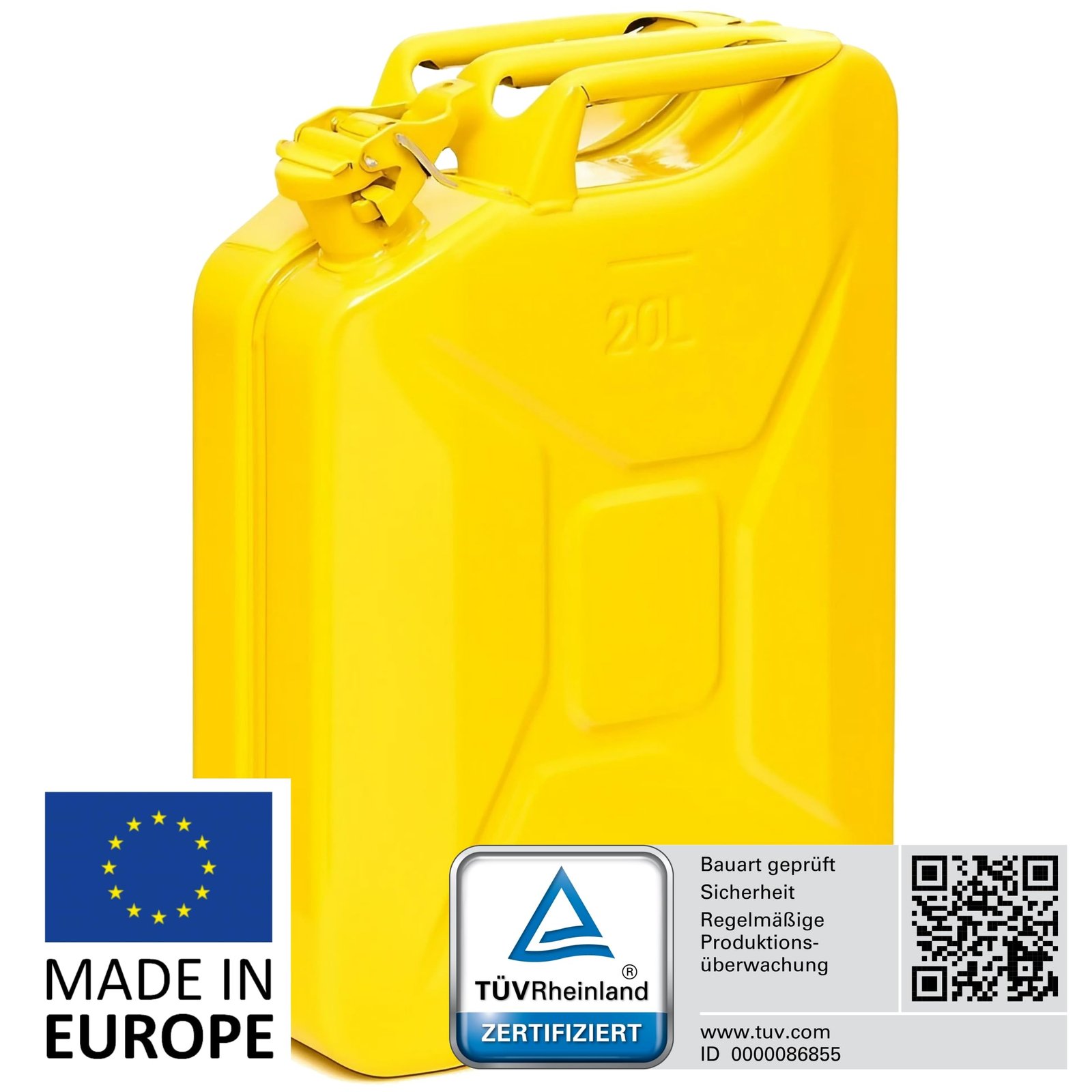BW® Benzinkanister Metall 20 Liter – Kraftstoffkanister Gelb – RAL 1018 – TÜV-geprüft und UN-Zulassung – 0,9mm Stahl nach DIN 7274 für Benzin Diesel E10 2-Takt – Made in Europe