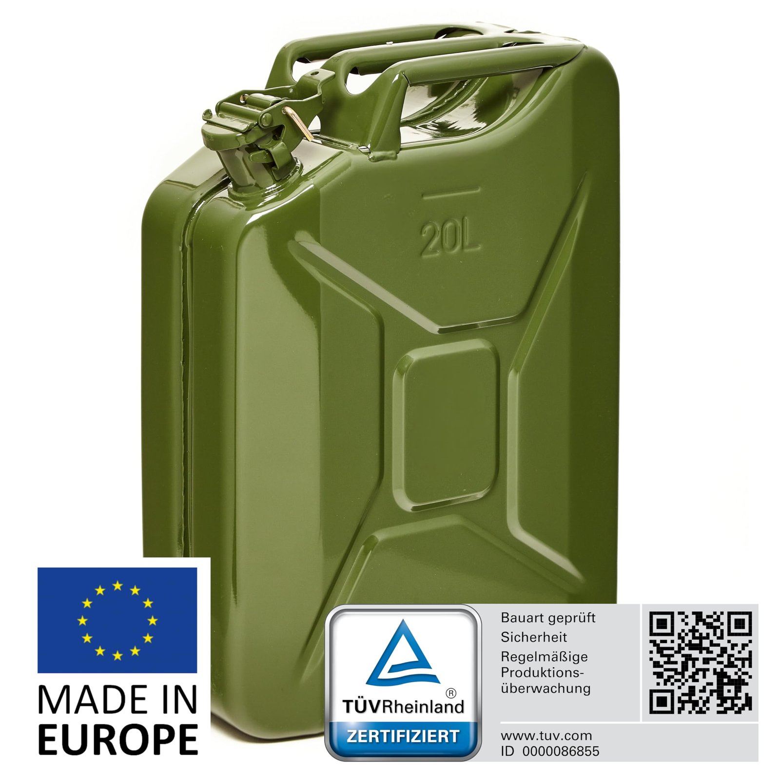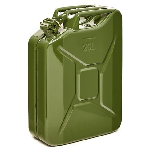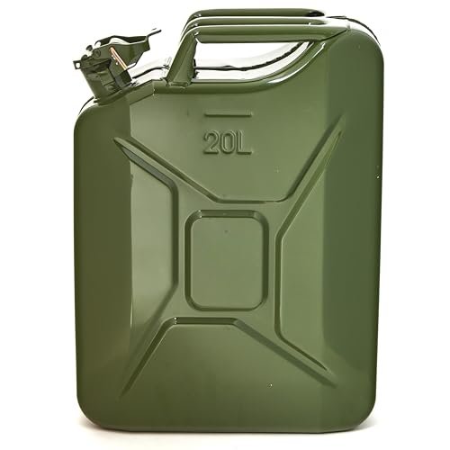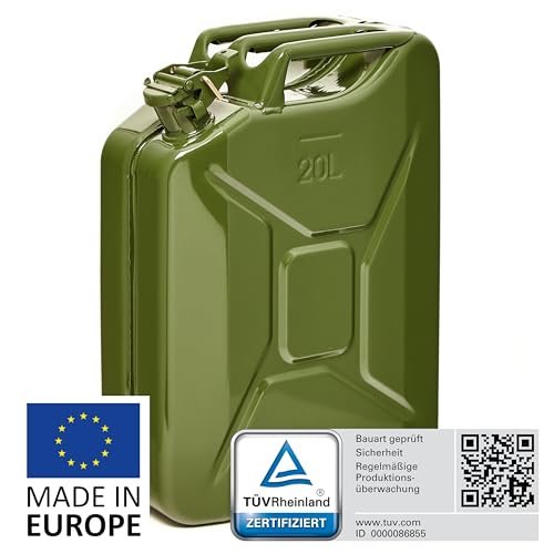 Hochwertiger 20L Metallkanister: Aus robustem, pulverbeschichtetem 0,9mm Stahl nach DIN 7274 gefertigt für langlebige Nutzung und Korrosionsbeständigkeit | Sicher & zugelassen: NATO Jerrycan – TÜV, UN, GGVSE und BAM zertifiziert – erfüllt höchste Sicherheitsanforderungen | Schnelles, sauberes Ausgießen: Großer Ausgießer mit breitem Entlüftungskanal für schnelles sicheres Betanken in unter 25 Sekunden | Vielseitige Anwendung: Geeignet für Benzin, Diesel, E10 und 2-Takt-Gemische – ideal als Reservekanister | Großes Fassungsvermögen: 20L Volumen, perfekt für lange Fahrten oder professionelle Einsätze (Generator, Boot, Offroad, Werkstatt)