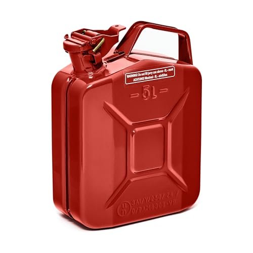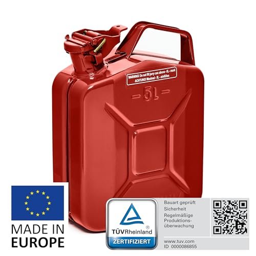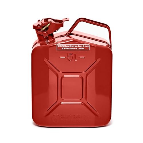 Hochwertiger 5L Metallkanister: Aus robustem, pulverbeschichtetem 0,9mm Stahl nach DIN 7274 gefertigt für langlebige Nutzung und Korrosionsbeständigkeit | Sicher & zugelassen: NATO Jerrycan – TÜV, UN, GGVSE und BAM zertifiziert – erfüllt höchste Sicherheitsanforderungen | Schnelles, sauberes Ausgießen: Großer Ausgießer mit breitem Entlüftungskanal für schnelles sicheres Betanken in unter 25 Sekunden | Vielseitige Anwendung: Geeignet für Benzin, Diesel, E10 und 2-Takt-Gemische – ideal als Reservekanister | Großes Fassungsvermögen: 5L Volumen, perfekt für lange Fahrten oder professionelle Einsätze (Generator, Boot, Offroad, Werkstatt)