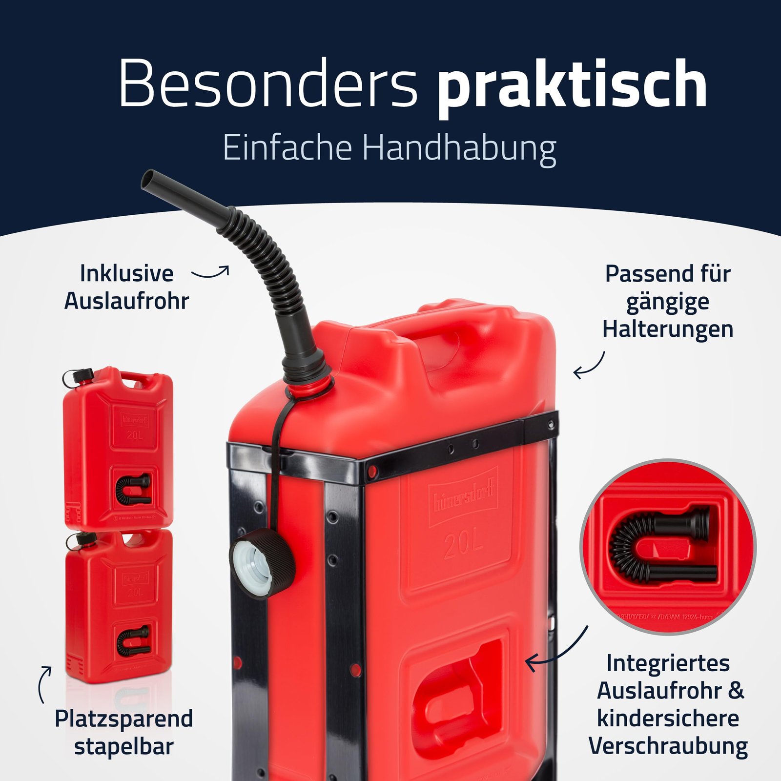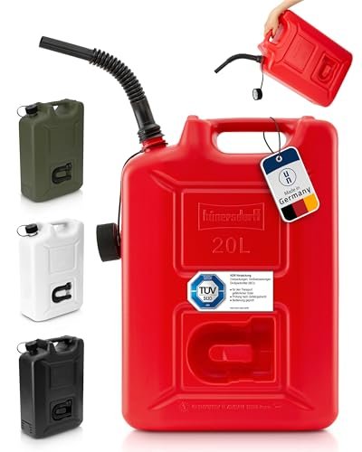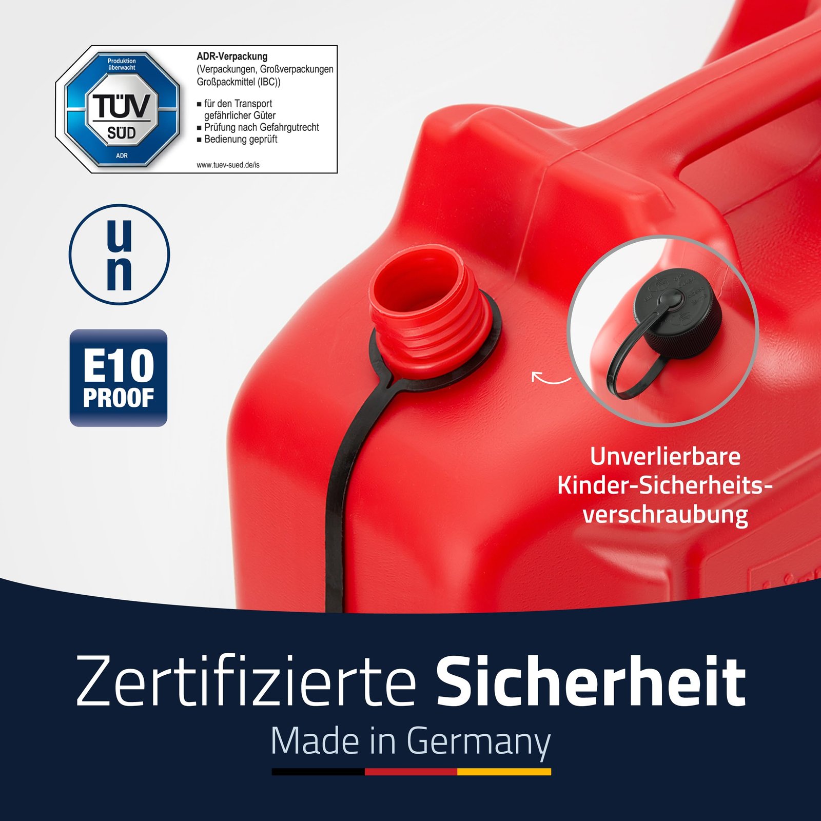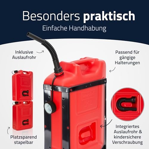 Sichere und vorschriftsmäßige Fertigung: Kraftstoff-Kanister PROFI 20l erfüllt mit der UN-Zulassung für Benzin, Diesel und andere Gefahrgüter höchste Sicherheitsanforderungen für den Transport flüssiger Güter. Hält absolut dicht | Praktische und geschützte Handhabung: Mit im Kanisterkörper integriertem Auslaufrohr und unverlierbarer Kinder-Sicherheitsverschraubung. 10-20l platzsparend stapelbar und passend in Kanisterhalterung | Passend für alle gängigen Tanköffnungen (Benzin und Diesel) und für alle Fahrzeuge mit Benzin-Fehlbetankungsschutz (nicht geeignet für Fahrzeuge mit Diesel-Fehlbetankungsschutz) | Lieferumfang: Kanister mit 10/20 Liter Fassungsvermögen, Maße T x B x H (mm): 165 x 350 x 495, Gewicht 1250g, Farbe rot